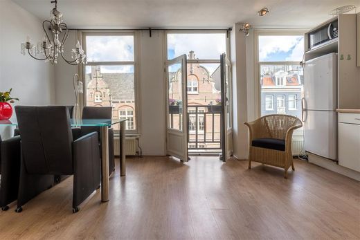 The apartment is situated on the third floor of an attractive building in the quiet part of the renowned Albert Cuypmarkt, near to the Woustraat. The entrance gives access to the hall, with the living room at the front, the separate toilet and the bathroom in the middle, and the bedroom to the rear. The stylish living room is light, having three large windows and an open kitchen with doors opening onto the street side. At this height you look out over the Albert Cuypmarkt.